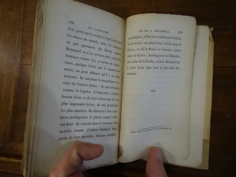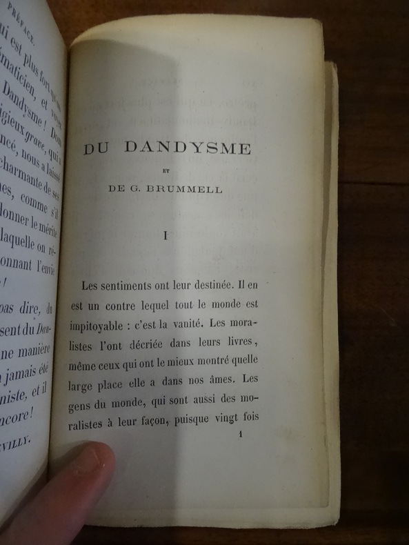 Paris Lemerre, s.d. [1900] 1 vol. relié in-16, demi-basane verte à coins, dos à nerfs orné de fleurons et encadrements dorés, tête dorée, (4) + 273 + (7) pp., 1 portrait de l'auteur (à 20 ans) en frontispice gravé par Martinez et 1 portrait de Brummell hors-texte. Dos passé et coins légèrement émoussés. Sinon en très bonne condition.