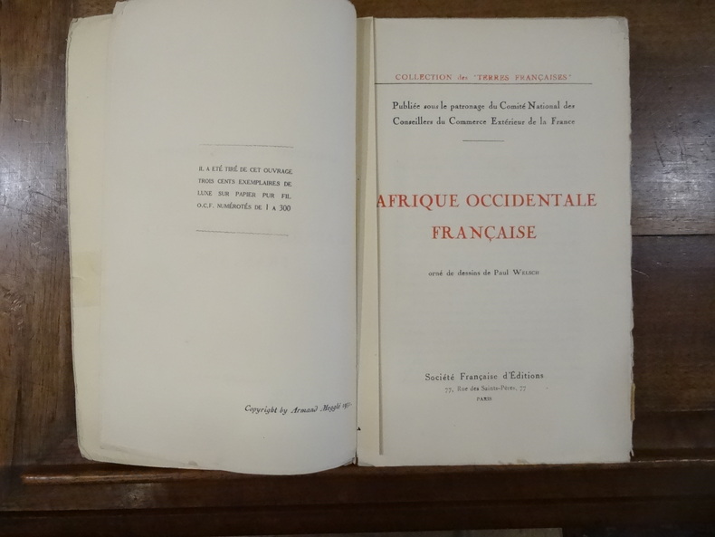 Sept volumes in 8 brochés, illustrations hors-texte sur papier couché, cartes. Agence économique de l’Afrique occidentale Française - Librairie Larose Paris.1) la Guinée française : 23 pages 4 illustrations photos. Sur papier couché, une carte sur double page.1935. 2) L’Afrique occidentale française 39 pages, 8 planches hors-texte sur papier couché. 3) La colonie du Niger 24 pages, 2 planches hors-texte 1 carte sur double page. 1936. 4) Le Dahomey 19 pages, 4 planches hors-texte, une carte sur double page. 1934. 5) Le Sénégal 32 pages, 4 planches hors-texte sur papier glacé. 1 carte sur double page 1936. 6) La Côte d’Ivoire 23 pages, 4 planches hors-texte, une carte sur double page. 1935. 7) Le Soudan français 28 pages, 4 planches hors-texte une carte sur double page. 1936