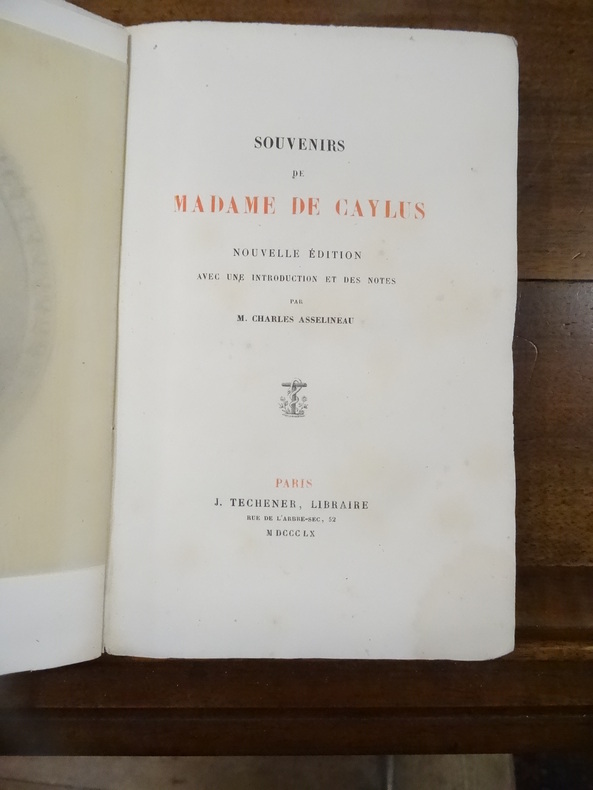 P., Techener, 1860, pt in-8°, xlv-268 pp, un portrait de Mme de Caylus en frontispice et 4 planches hors texte gravées sur métal d'après J. Leman, table analytique, ex. sur vergé, broché, bon état