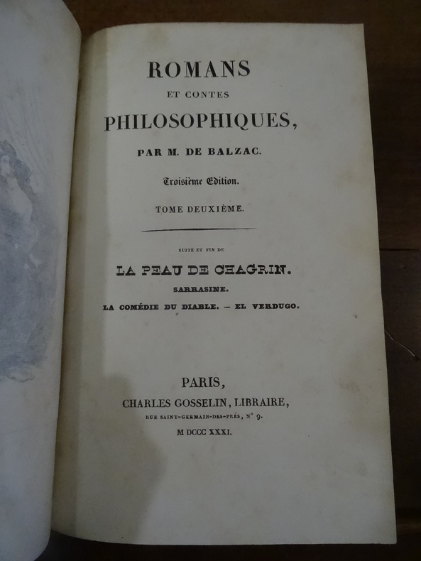 Paris, Gosselin, 1831. 3 volumes in-8, demi basane époque, dos lisses ornés de fleurons, de roulettes et de filets dorés, titre doré, toutes tranches jaunes. 400 pp; faux-titre, titre, 418 pp; faux-titre, titre, 396 pp. Edition originale pour "Sarrasine", "El Verdugo", 'La Comédie du Diable" au tome II et "L'Enfant maudit", "L'Elixir de longue vie" "Les Proscrits", "Le Chef-d'oeuvre inconnu", "Le Réquisitionnaire", "Etude femme", "Les Deux rêves" (devenu "Sur Catherine de Médicis"), "Jésus-Christ en Flandre" et "L'Eglise" au tome III (Clouzot indique que toutes ces édition originales sont reliées au tome III, alors que la table des matières indique bien que Sarrasine, El Verdugo et la Comédie du Diable, sont reliées au tome II). 3 frontispices sur Chine par Johannot. Mention fictive de 3ème édition. Erreur du relieur sur la pièce de titre, qui a orthographié Balsac (sic), tache sur le plat supérieur du tome II, rousseurs, brunissures au début du tome III, 1 frontispice restauré, 1 petit manque sur 1 autre, petite mouillure à la fin du tome I.