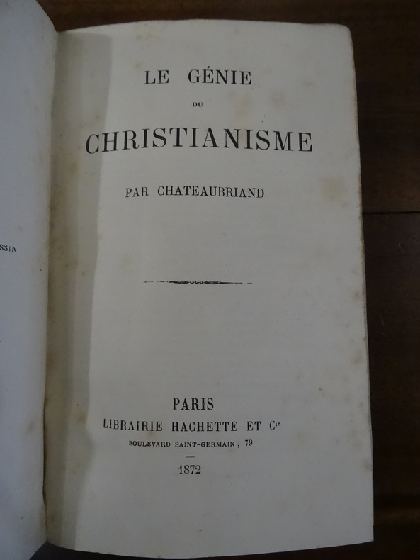 1 ER VOLUME : TOME 1 : PREMIERE PARTIE DOGMES ET DOCTRINE. LIVRE PREMIER - MYSTERES ET SACREMENTS / TOME 2 : LIVRE SECOND : POESIE DANS SES RAPPORTS AVEC LES HOMMES /// 2 EME VOLUME : TOME 3 : GENIE DU CHRISTIANISME - SUITE DE LA QUATRIEME PARTIE / TOME 4 : GENIE DU CHRISTIANISME - LIVRE SIXIEME - SERVICES RENDUS A LA SOCIETE PAR LE CLERGEET LA RELIGION CHRETIENNE EN GENERAL /// Classification Dewey : 230-Christianisme. Théologie chrétienne