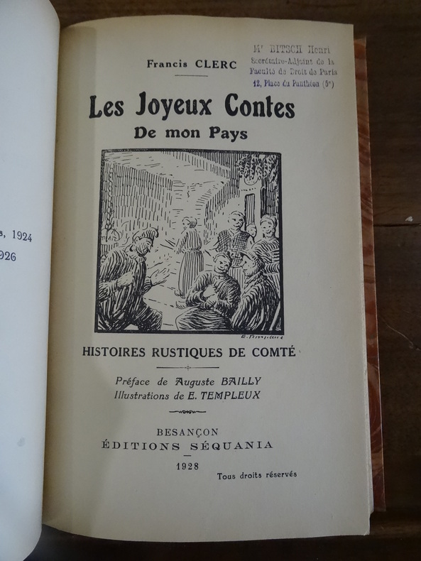 Besançon, Editions Séquania, 1928. In-8, demi basane, dos à faux-nerfs, titre doré. 178 pp, 1 p non chiffrée. Ouvrage illustré de compositions in-texte, en noir, par E. Templeux. Tampon d'un ancien propriétaire sur la page de titre, papier jauni.