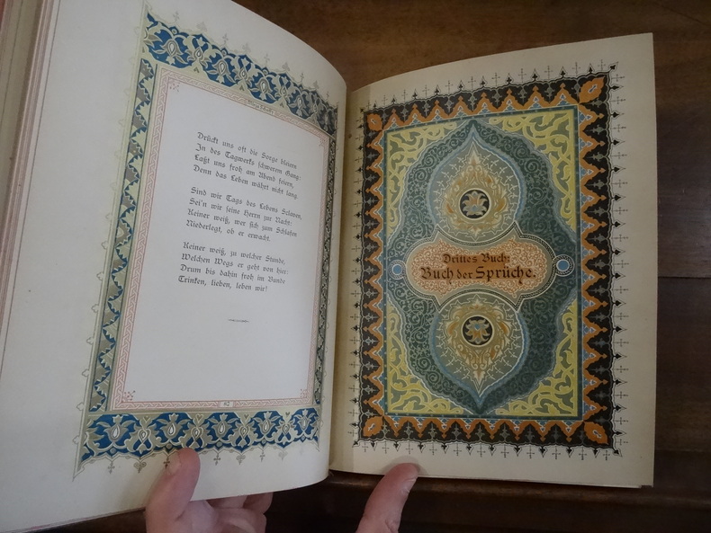 Berlin, Hofmann, sans date (circa 1880). In-8 carré, percaline éditeur, titre doré au dos et en blau sur le plat supérieur, décor noir, argenté et doré sur le plat supérieur, toutes tranches rouges. 217 pp. Ouvrage orné de décors polychromes, dont 8 à pleines pages en comptant le titre, texte encadré d'ornements polychromes, le tout dans un style orientale. Dorures du titre au dos passées, plat inférieur un peu taché, quelques rousseurs, 1 cahier déréglé.