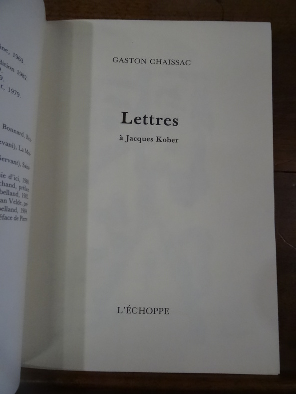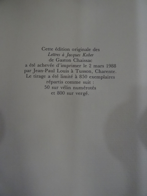 Caen. L'Echoppe. 1988. In-8° broché. Frontispice de Gaston Chaissac. 43 pages. E.O. 1/50 de tête sur vélin d'Arches. [50 vélin d'Arches / 800 vergé].