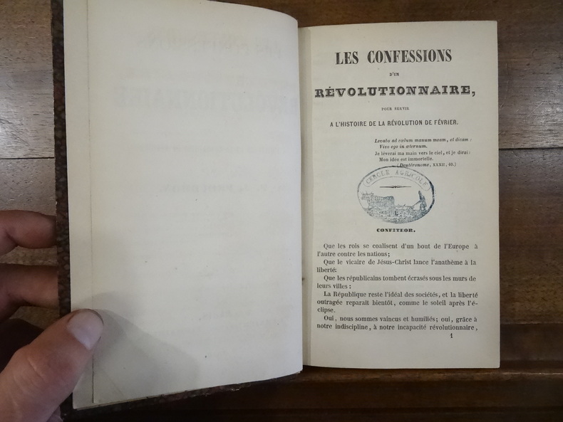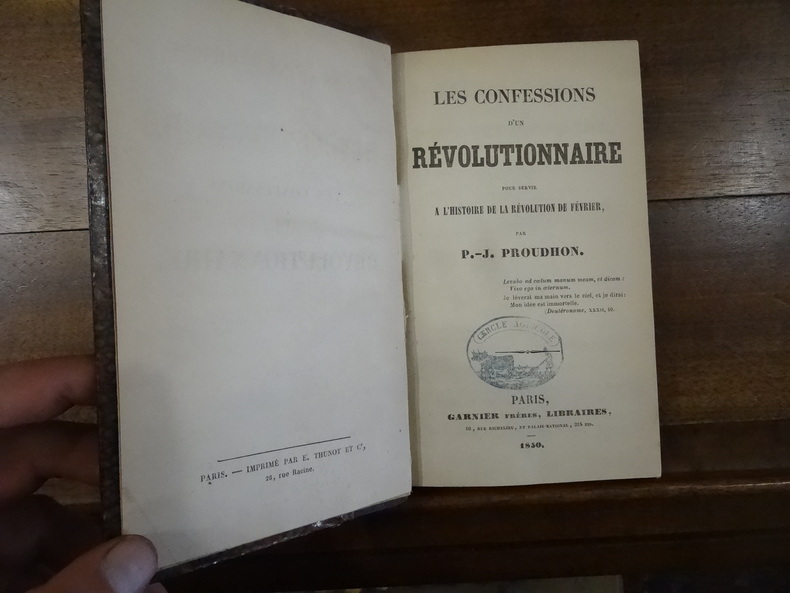Édition originale imprimée sur deux colonnes. Représentant du peuple à l'Assemblée Nationale en 1848 et rédacteur de plusieurs journaux, Proudhon fut condamné pour son opposition à Louis Napoléon Bonaparte, à la prison (1849-1852) où il rédigea ses Confessions. « C'est une sorte d'histoire de France depuis 1789 jusqu'aux journées de Février 1848, dans laquelle celles-ci étaient jugées par un de leurs propres acteurs ; comme des mémoires sur la vie et la pensée de celui qui les rédigea, desquels on peut extraire cette formule qui résume tout le programme proudhonien : Il faut vaincre le pouvoir, en ne lui demandant rien ; prouver le parasitisme du capital, en le suppléant par la liberté des individus, en organisant l'initiative des masses. » (Bourgeat). Bourgeat, 251 ; Haubtmann, 1068 ; Nettlau, 59.
