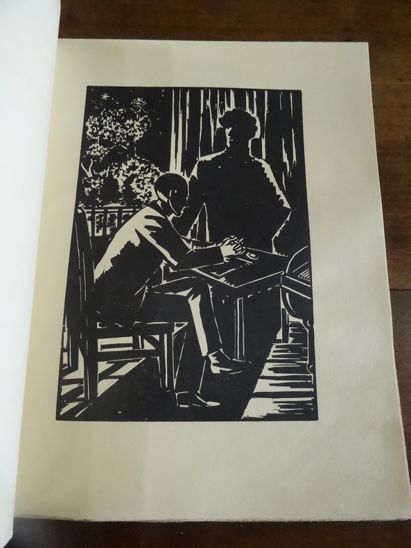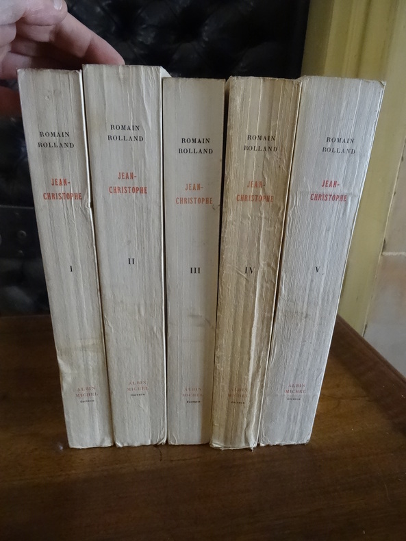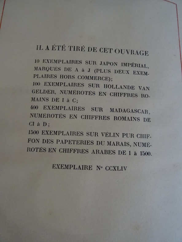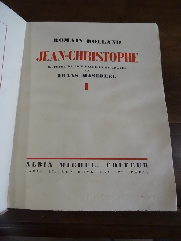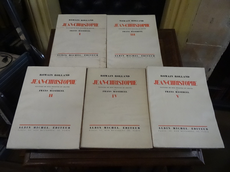 Paris, Albin Michel, 1925-1927. 5 volumes in-4, brochés, couverture rempliée. Faux-titre, titre, 1 f non chiffré, 281 pp; faux-titre, titre, 1 f non chiffré, 345 pp; faux-titre, titre, 2 ff non chiffrés, V, 270 pp; faux-titre, titre, 290 pp; faux-titre, titre, 333 pp. Tirage limité numéroté à 2010 exemplaires, celui-ci étant un des 400 sur Madagascar, 3ème grand papier, portant le numéro CCLXIV. Ouvrage illustré de 500 bois in et hors-texte, gravés et dessinés par Frans Masereel. Edition estimée et cotée, surtout en grand papier (cf Carteret, IV, 345). Exemplaire non coupé. Plats salis et gondolés à cause de l'humidité, humidité ayant laissé quelques traces discrètes en début et fin de volumes, quelques rousseurs.