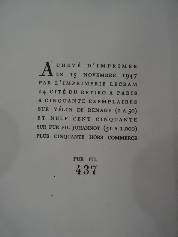Paris, aux éditions Denoël, 1947. In-8, broché, couverture rempliée. 97 pp. Tirage limité numéroté à 1000 exemplaires, celui-ci étant un des 950 sur pur fil Johannot, portant le numéro 437. Dos jauni, quelques rares rousseurs (essentiellement sur les tranches).