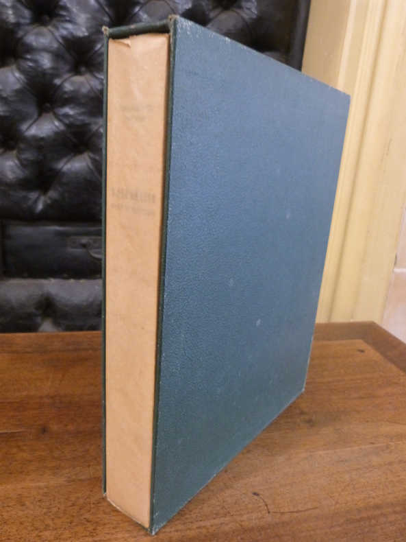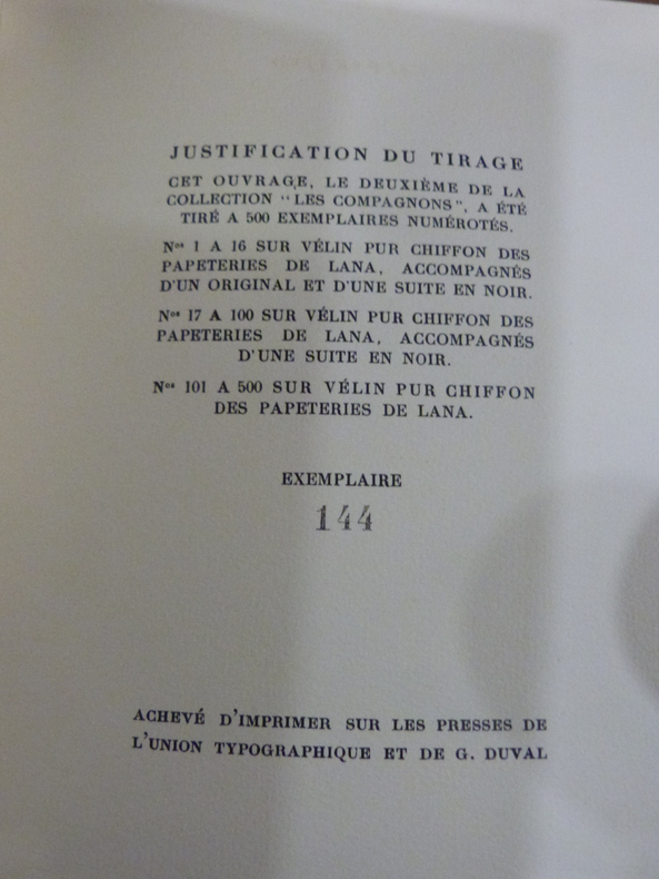 Paris, Au Moulin de Pen-Mur, sans date, 1 volume in-4 de 245x195 mm environ, 285 pages, en feuillets libres sous chemise rempliée titrée en vert, et emboîtage de l'éditeur vert émeraude et dos crème. Exemplaire N° 89, un des exemplaires sur vélin de Lana avec une suite en noir (16 dessins + 1 portrait), numérotés de 17 à 100. Emboîtage un peu usé, couverture intérieure légèrement insolée avec infime début de fente sur le dos, sinon bon état intérieur.