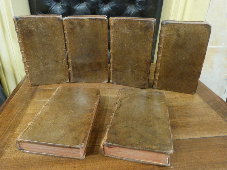 Paris, Cavelier, 1738. 5 tomes en 6 volumes in-12, plein veau époque, dos à nerfs ornés de fleurons, de motifs floraux et de filets dorés, titre doré, toutes tranches rouges. Faux-titre, titre, 2 ff non chiffrés, 548 pp, 2 ff non chiffrés; faux-titre, titre, 527 pp; faux-titre, titre, 525 pp; faux-titre, titre, 609 pp; faux-titre, titre, 743 pp (pagination continue entre les 2 derniers volumes), 33 pp (Oeuvres diverses). Ouvrage illustré d'un portrait de l'auteur. 1 ex-libris armorié contrecollé sur le contreplat supérieur appartenant aux marquis Barbeyrac de Saint-Maurice, famille de Haute-Provence et un ex-libris manuscrit sur une page de garde, appartenant à Jean de Vichet de Montpellier. 3 coiffes restaurées, 3 coiffes manquantes, manques sur 4 coiffes, coins émoussés, 1 fente sur 1 mors, papier roussi par endroits, quelques rousseurs et brunissures, petite mouillure au début du tome II.