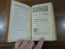 Rarissime exemplaire de premier tirage complet des 4 frontispices de l’édition originale définitive du Théâtre de Pierre Corneille. A Paris, chez Guillaume de Luyne, Libraire Juré, au Palais, en la Galerie des Merciers, 1682. Avec Privilège du Roy Partie 1 : frontispice gravé, portrait de Corneille, xcviij pp. (y compris le titre), (1) f. pour le titre de Mélite, 586 pp. et (1) f. pour le Privilége. Le portrait de Corneille ne porte pas de signature ; il représente le poëte dans le costume des premières années du règne de Louis XIV : perruque, calotte et rabat. Partie 2 : frontispice gravé, cx pp., (1) f. pour le titre du Cid, 597 pp., (1) p. pour le Privilège. Il y a deux sortes d'exemplaires de cette IIè Partie ; les uns comptent 597 pp. et contiennent un Extrait du Privilège au verso de la p. 597 ; les autres n'ont que 596 pp. et l'Extrait du Privilège y occupe le recto du feuillet suivant. Cette différence vient de ce que, pendant le tirage, Corneille a supprimé vingt vers dans la scène Vè du cinquième acte dé Théodore (p. 587). La feuille Bb, dernière du volume, s'est ainsi trouvée subir un remaniement complet. Partie 3 : frontispice gravé, lxxxiv pp., (1) f. pour le titre de Rodogune, 618 pp. et (1)f. pour le Privilège. Partie 4 : frontispice gravé, xxij pp., (1) f. pour le titre de Sertorius, 591 pp., (1) p. pour le Privilège. 4 in-12 reliés en veau fauve, dos à nerfs ornés, deux mors faibles, tranches rouges. Reliure de l’époque sortant de l’Atelier de Jean Le Vasseur, relieur du roi Louis XIV. Réf: Bibl. R. Esmérian, Paris, 8 décembre 1972, n° 63). 151 x 85 mm.