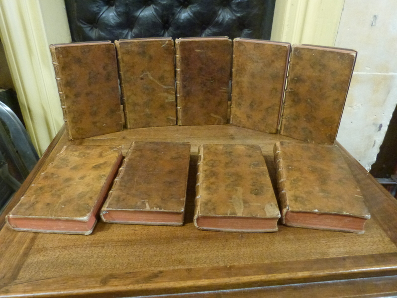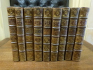 Leide, Pierre Vander Aa, 1719. 9 volumes in-12 sur 10, pleine basane époque, dos à nerfs ornés de fleurons, de filets et de roulettes dorés, titre doré, toutes tranches rouges. Titre gravé, titre, 154 pp, 171 pp; titre gravé, titre, 151 pp, 131 pp; titre gravé, titre, 167 pp, 88 pp, 142 pp; titre gravé, titre, 214 pp, 174 pp; titre gravé, titre, 160 pp, 186 pp; titre gravé, titre, 156 pp, 174 pp; titre gravé, titre, 184 pp, 150 pp; titre gravé, titre, 252 pp, 114 pp; titre gravé, titre, 166 pp, 167 pp, 3 pp non chiffrées, 70 pp (catalogue de l'éditeur). Ouvrage illustré de 9 titres gravés avec des fleurons variés et de 19 planches hors-texte non signées (cf Cohen, 461). Manque le tome I qui contient la pièce Amphitryon et le frontispice dépliant, 4 coiffes manquantes et 5 autres abîmées, coins émoussés, frottements sur la plupart des plats, 7 mors partiellement fendus, mais néanmoins solides, picées de tomaisons frottées, nombreuses pages brunies, pages 121-125 du tome III détachées, taches brunes dans la marge inférieure du tome IV; Agréable exemplaire malgré tout.