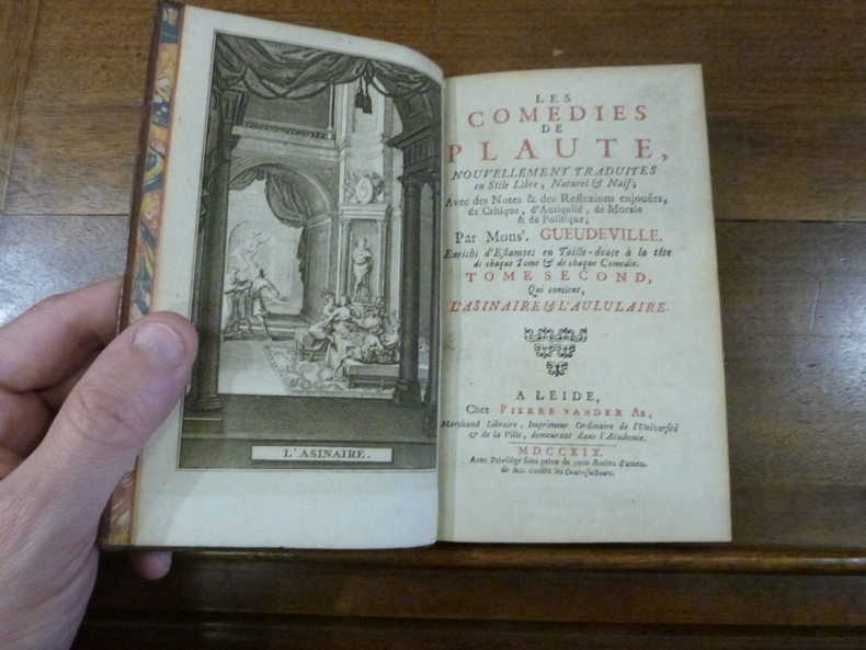 On le sait, Plaute est l'auteur de nombreuses pièces comiques latines, très en vogue dans tout l'Empire romain. Plus tard, il a influencé grandement des auteurs dramatiques comme Molière, Racine ou Shakespeare. Les traductions de son oeuvre sont légion. Parmi elles, figure celle de M. de Gueudeville (1652- v. 1720). La critique, surtout contemporaine, a souvent été acerbe à son sujet, pointant notamment les libertés prises par le traducteur. Sa version n'en demeure pas moins l'une des plus populaire du XVIIIe siècle, reflet de son temps et de ses attentes, que ce soit en matière de style ou de dramaturgie. "Gueudeville a aussi traduit les comédies de Plaute: rien n'est plus difficile que de traduire les pièces d'un auteur dont Quintilien a dit que "si les Muses avaient voulu parler le langage des hommes, elles auraient choisi celui de Plaute". Cette version des vingt comédies qui nous restent de ce poète romain, offre un style inégal qui ne rend ni l'élégance ni le sel de l'original. On désirerait également plus de justesse dans les remarques." (Philippe Guilbert, Mémoires biographiques et littéraires, par ordre alphabétique, sur les hommes qui se sont fait remarquer dans le département de la Seine-Inférieure, 1812, p. 536; sur ce traducteur très prolifique et parfois injustement jugé, voir également Aubrey Rosenberg, Nicolas Gueudeville and His Work (1652-172?), 2012, pp. 261-262 et Tristan Vigliano, Nicolas Gueudeville préfacier : une appropriation des textes humanistes au début du XVIIIe siècle).