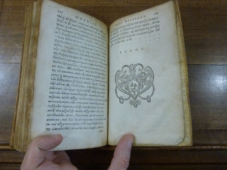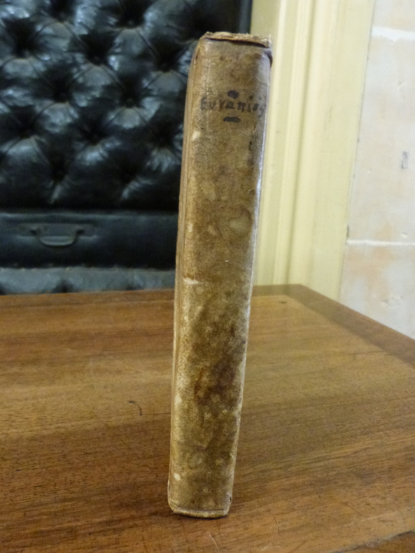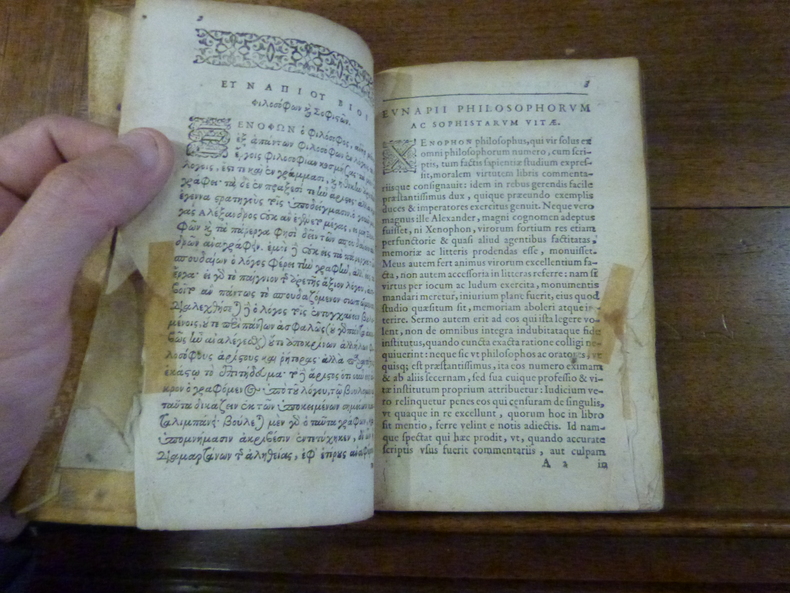 Sans lieu, Apud Hyeronymum Commellium, 15.6 [1596]. Petit in-8 en plein vélin de l'époque au dos lisse. 4 feuillets non chiffrés (titre, aux lecteurs, et vie de l'auteur), 223 pp, 4 feuillets d'index. Edition bilingue latin-grec. Déchirures avec manque sur les 9 premiers feuillets dont les 3 premiers avec des manques au texte et avec des "restaurations" au scotch, mouillure claire sur la partie basse des pages sur tout l'ouvrage, première charnière intérieure partiellement fendue. Vendu en l'état.