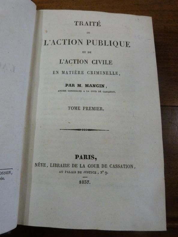 Nêve libraire de la cour de cassation. 1837. In-8. Relié demi-cuir. Etat d'usage, Coins frottés, Dos lisse, Quelques rousseurs. LVI+586 pages - plats, contre plats, gardes et tranches jaspés - auteur, titre, tomaison, filets et ornements dorés sur le dos - papier jauni, rousseurs - plats légèrement frottés - accroc sur le 2eme plat.. . . . Classification Dewey : 345-Droit pénal