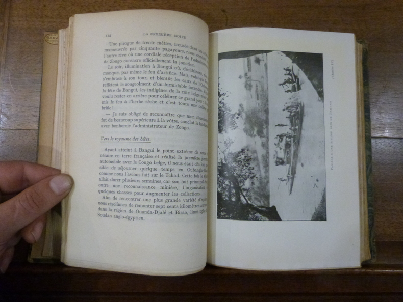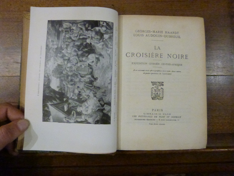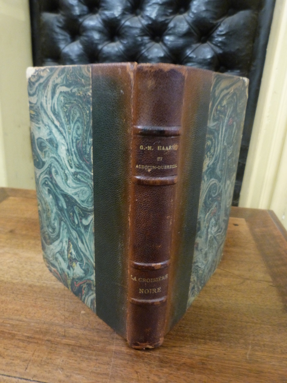 3 ff.n.ch., vii et 261 pp., 1 f.n.ch. de table, 1 f.n.ch. d'achevé d'imprimer, 4 cartes, dont 3 lithographiées en couleurs dépliantes et 80 planches hors texte en héliogravure, la plupart reproduisant les superbes photographies de l'expédition (ethnies, types, scènes festives, animaux, paysages, etc), les autres d'après les dessins d'Alexandre Iacovleff. Les 57 compositions décoratives dans le texte sont de Georges Tcherkassov.Thiébaud 484-485. Édition originale, tirée à 2500 exemplaires. Un des exemplaires sur alfa.Avec Louis Audouin-Dubreuil, Gaston Doumergue, Président de la République Française, évoqua un jour devant André Citroën et Georges-Marie Haardt l'intérêt qu'aurait une liaison régulière entre les colonies africaines et Madagascar, territoire français isolé dans l'océan Indien. Ces quelques mots lâchés au hasard d'une conversation vont donner naissance à la "Croisière Noire": une expédition qui demandera plus d'un an de préparation, suscitera un engouement inouï tant du public que des milieux scientifiques, artistiques et économiques et fera parcourir à 8 autochenilles équipées d'un dispositif de propulsion Kégresse avec bandes de roulement en caoutchouc, plus de 28 000 kilomètres, à travers l'Afrique, à partir de Colomb-Bechar. Georges-Marie Haardt traversera ainsi avec son équipe l'Algérie, le Niger, le Tchad, l'Oubangui-Chari, et le Congo Belge. À Kampala, leur colonne se scindera en quatre groupes qui rallieront l'océan Indien et Tananarive, chacun par un itinéraire différent (Mombasa, Dar-Es-Salam, Mozambique et Le Cap). Partout, ils rencontreront un accueil délirant