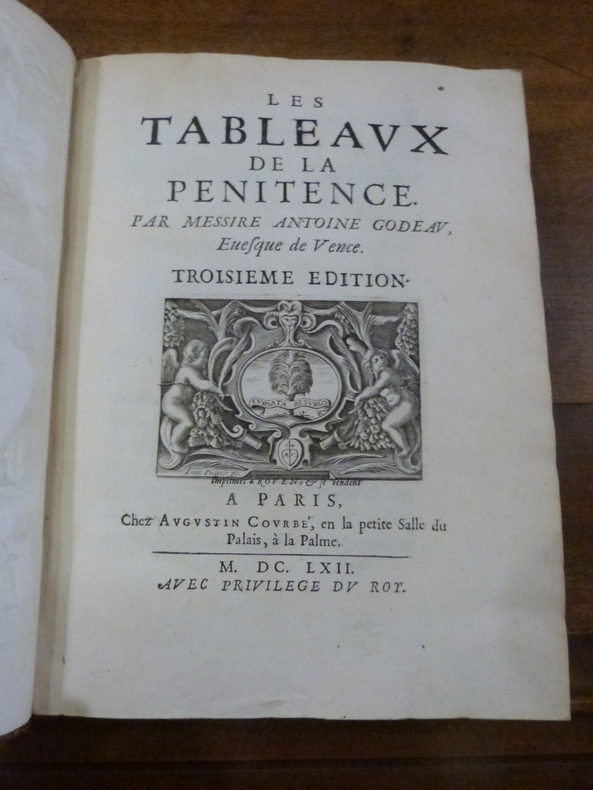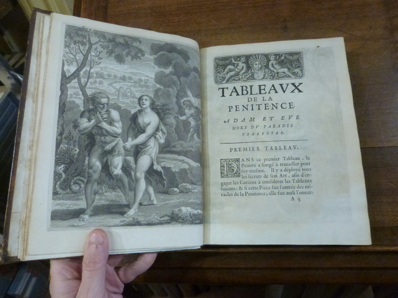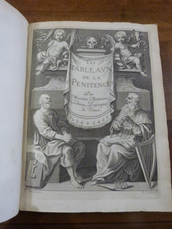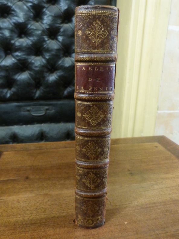 Couverture usagée-- Le dos semble être en plusieurs parties, et refait mais il y a déjà très longtemps et il est décollé ---A l'intérieur de la couverture, une annotation manuscrite, au début et à la fin---La gravure représentant les tableaux de la pénitence a été collé sur une 2e page--La page avec le titre a été découpée au milieu dans le sens de la largeur sur 1 cm L'intérieur est très correct (quelques tâches - vraiment très peu--quelques pliures de pages en bas--envoi en colissimo recommandé, colis entre 1 et 2 kilos