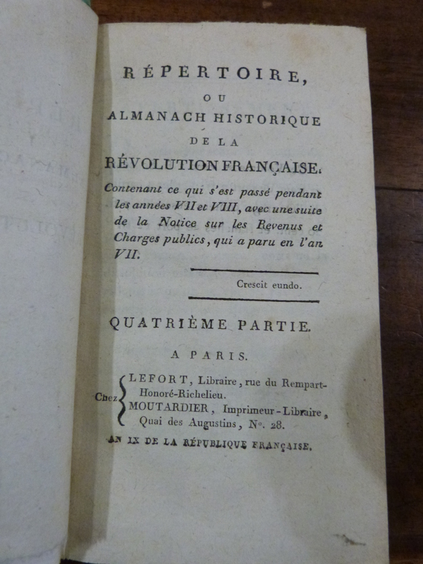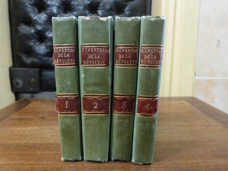 Paris, an VII - an IX -1798-1800, Lefort et Moutardier. 4 volumes in-12, cartonnage à la Bradel de l'époque, titre doré. 406 pp; 480 pp; 404 pp; 344 pp. Ex-libris d'Emmanuel Viollet-le-Duc sur les quatre contreplats supérieurs. Coiffes abîmées, coins émoussés, dos assombris, papier jauni, quelques rousseurs, déchirures pages 193-194 au tome I et 267-268 au tome II avec petites atteintes au texte, 4 parties sur 6.