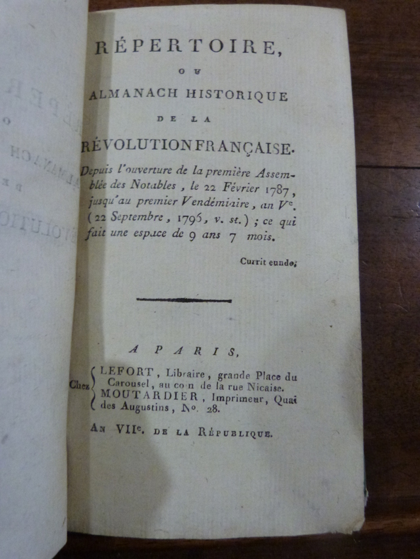 Cette série comporte 6 tomes, le dernier étant consacré à l'Empire français depuis le rétablissement du culte et la paix d'Amiens, jusqu'au traité de Tilsitt, (cf Feller, tome VI, 408). Emmanuel Viollet-le-Duc (1781-1857), père du célèbre architecte, est un haut fonctionnaire, poète et également un bibliophile avertit. Il composa lui-même un "Catalogue des livres composant la bibliothèque poétique de M. Viollet-le-Duc" en deux volumes. Le soin que Viollet le Duc prit dans son catalogue de souligner les conditions, d'indiquer la grandeur des marges, la bonne conservation des reliures ou la qualité des papiers, témoignent de son expérience et de son ardeur de bibliophile.