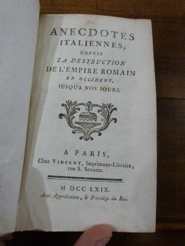 Avertissement : on sera peut-être surpris qu'une histoire aussi vaste et aussi compliquée que celle de l'Italie, n'occupe ici qu'un volume; mais on ne peut manquer d'être court, quand on ne s'attache qu'à recueillir les faits intéressants et dignes de la postérité. Cette histoire,malgré ses bornes étroites, comprend ce qu'il y a de plus essentiel et de plus important dans l'Histoire d'Italie, et doit paraître d'autant plus utile, que cette portion si considérable de l'Europe a jusqu'à présent été négligée par nos historiens... Personne n'est, sans doute, plus en état de remplir ce vuide, que l'Auteur exact et judicieux de l'Abrégé chronologique de l'Histoire d'Italie,...Pour une plus grande clarté, nous avons divisé nos Anecdotes en 2 parties. La première comprend l'Italie, formant un seul état ; Et la seconde comprend cette même Italie formant un assemblage de différents Etats. Dans celle-là nous présentons l'Histoire des Rois et des Empereurs, maîtres de l'Italie ; Et dans celle-ci, l'Histoire des Papes, l'Histoire des Rois de Sicile, celle de Florence, celle de Milan, qui toutes ont un article à part. ...