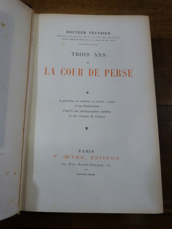 Paris; F. Juven, Éditeur, sans date, 1 cartonnage percaline éditeur de format 22,5 x 14,5 cm, tranches dorées, VI + 456 pages, 4 planches en couleur, 4 cartes, 1 plan et 79 illustrations d'après les photographies inédites et des croquis de l'Auteur, cartonnage en bel état, légers frottements aux coiffes, reliure bien solide, quelques rousseurs éparses, en particulier sur les serpentes protégeant les gravures, bon état général.