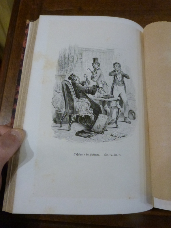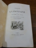 Fables de la Fontaine. Tome II (Livres VII-XII) des œuvres complètes de La Fontaine, Le Livre VII des Fables de La Fontaine est le premier livre du deuxième recueil des Fables rimées de Jean de La Fontaine, écrit en 1678 (publié en 1679). Cette série de dix-sept fables met en scène des animaux ou des hommes. Ce livre contient des fables relativement populaires, comme La Laitière et le Pot au lait ou Les Animaux malades de la peste, un animal dans la lune... Le Livre VIII est paru en 1678 et contient : La Mort et le Mourant Le Savetier et le Financier Le Lion, le Loup et le Renard Le Pouvoir des fables L'Homme et la Puce Les Femmes et le Secret Le Chien qui porte à son cou le dîné de son maître Le Rieur et les Poissons Le Rat et l'Huître ..etc volume relié, plein veau lisse époque, 20x15, coins émoussés, très bel état intérieur, 6 jolies gravures en taille douce, 320pp. Paris, Lefevre, Libraire, 1818 ref/81