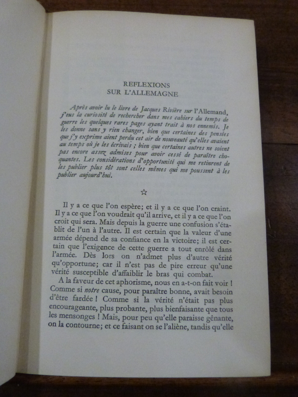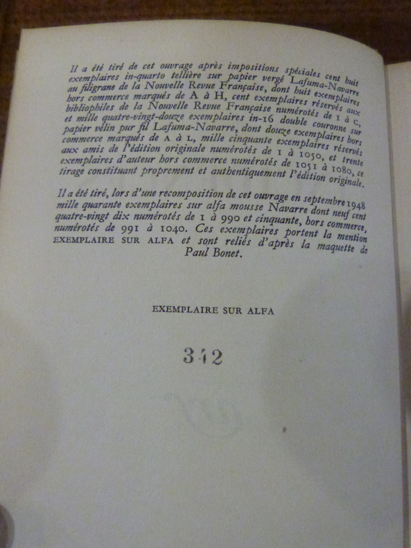 Paris, Gallimard, 1948. In-12, cartonnage Bonet. 212 pp, 3 pp non chiffrées. Tirage limité numéroté à 1040 exemplaires sur alfa mousse, portant le numéro 342, ces exemplaires sont reliés d'après la maquette de Paul Bonet. Cartonnage et papier jauni, coiffes un peu frottées.
