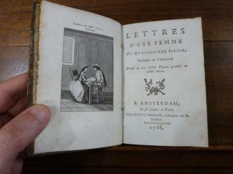 Première édition française, complète avec les 11 planches de figures gravées. La première édition allemande parut à Augsbourg en 1777. L'auteur supposé, Paul De Stetten (mort à Augsbourg, le 12 février en 1808, à l'âge de 78 ans) fut maire d'Augsbourg et conseiller intime du roi de Bavière. Supercheries II; Cohen 959.First French edition of this fictional account of the life of a widow and the members of her family, translated from «Briefe eines Frauenzimmers aus dem XV. Jahrhundert, nach alten Urschriften», 1777. With a lengthy quasi-academic preface in which the novel (based on papers newly discovered and handed down through generations) is placed in its historical perspective, so that accepted dates, such as seige of the fortress of Billenbach and the murder of the Marquard de Schellenberg, are challenged and biographical details of historical figures are corrected. The authenticity of the manuscript was only doubted on one score: that of the extreme unlikeliness of there having been two women in Germany in the fifteenth century who were able to read and write. The preface itself is prefaced by an advertisement which refutes all the historical arguments carefully set out by the author in the preface. Barbier II/1245-1246; Quérard IX/266; Supercheries II; Cohen 959 (confirme front. et 10 pl. grav.). Image disp.