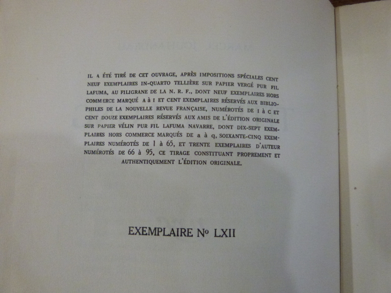 Paris, Editions de la nouvelle revue française, 1932. In-8, broché. 220 pp. Edition originale, tirage limité numéroté à 221 exemplaires, celui-ci étant un des 109 in-quarto tellière sur vergé pur fil Lafuma, tirage de tête, portant le numéro LXII. Cachet ex-libris d'Henri Bouillier sur la page de faux-titre. Bouillier (1924-2014) fut universitaire, bibliophile, critique littéraire à la NRF, sous le pseudonyme d'Henri Amer et auteur de nouvelles. 1 page de garde un peu grignotée sinon très bon état.