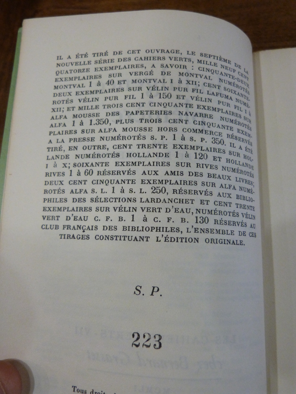 Grasset In-12 Broché PARIS Edition originale numerotée 1951 339 pages. LES CAHIERS VERTS N° 7. Un des exemplaires numérotés sur Alfa. Exemplaire non coupé en exellent état.Très bon état.
