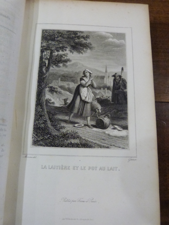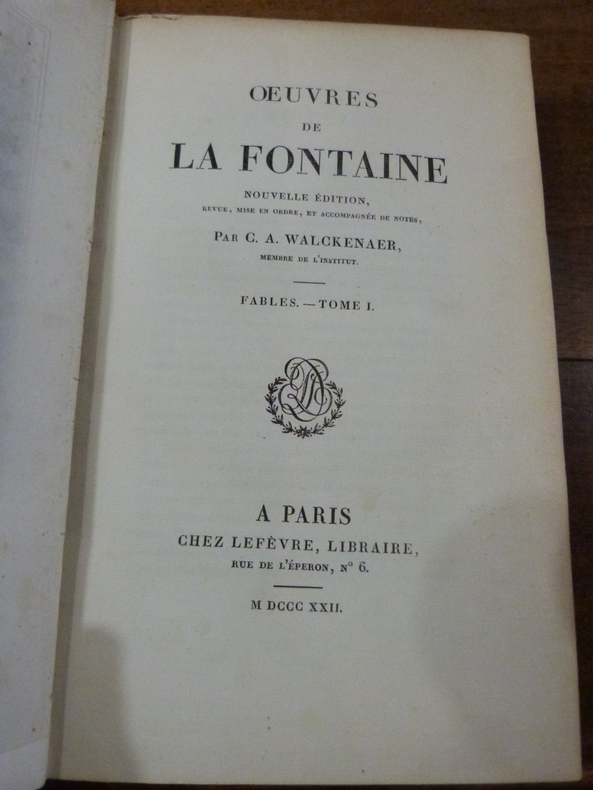 Complet. Avec les planches hors-texte de Tony Johannot publiées par Furne. Bonne édition des Oeuvres complètes de La Fontaine, en état satisfaisant (petit accroc à une coiffe sup., très fortes rouss. et mouill. claires, cahiers fort. roussis). Prix en l'état. Rochambeau, 653-654