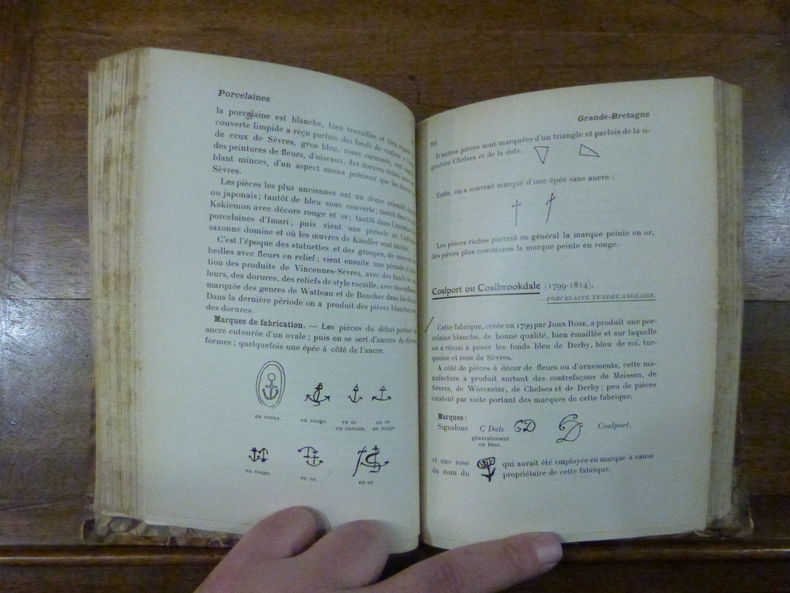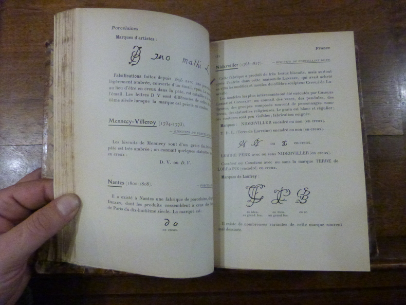 Paris, éd. Garnier, S.d. (vers 1920), 2e édition revue et corrigée, fort in-8, cartonnage toilé bleu clair éditeur, couverture d'origine conservée, VII - 496 pp., ill. par un frontispice en coul., très nb. photos en noir et de très nb. marques et signes en noir des différentes manufractures, table des matières, Très bon guide pour reconnaiître les différences marques des différentes manufacture de faïences et porcelaines en Europe. Pas courant Bon état; la couverture est légèrement défraîchie et le papier jauni de façon uniformément