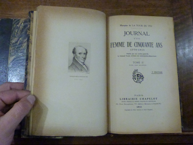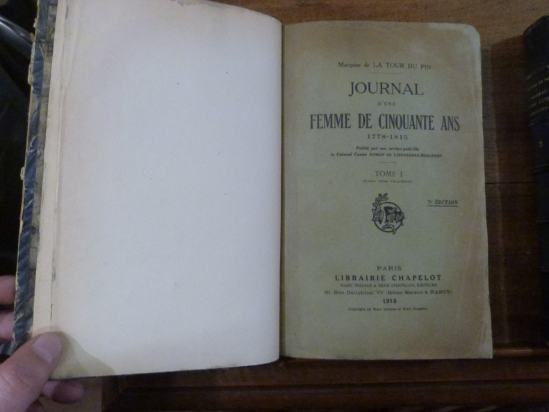 Présentation : Née en 1770, appartenant à la noblesse la plus ancienne, Henriette-Lucy Dillon épouse en 1787 le comte de Gouvernet qui deviendra marquis de La Tour du Pin en 1825. Grâce au dévouement de la future Madame Tallien, la comtesse de Gouvernet échappe à la Terreur, s'embarque à Bordeaux pour l'Amérique avec sa famille. Son Journal apporte quantité d'informations, de scènes et de portraits sur la fin de l'ancien régime, la Révolution, la vie sous le Consulat et l'Empire. Des pages très singulières et amusantes relatent l'exil en Amérique, où Henriette-Lucy, s'écartant de la vie mondaine des autres émigrés, se fait fermière, marque à ses armes ses mottes de beurre, se lie d'amitié avec les Indiens. Les Mémoires de la marquise de La Tour du Pin s'arrêtent en 1815. Afin de couvrir la période comprise entre 1815 et la mort de l'auteur (1853), Christian de Liedekerke Beaufort publie ici des pages de la Correspondance de la marquise avec ses amis, comme par exemple la comtesse de La Rochejacquelein et Madame de Staël. Ces deux ouvrages ne sont pas des copies neuves !