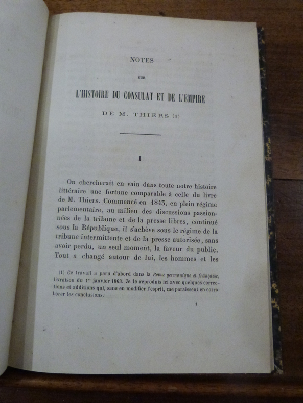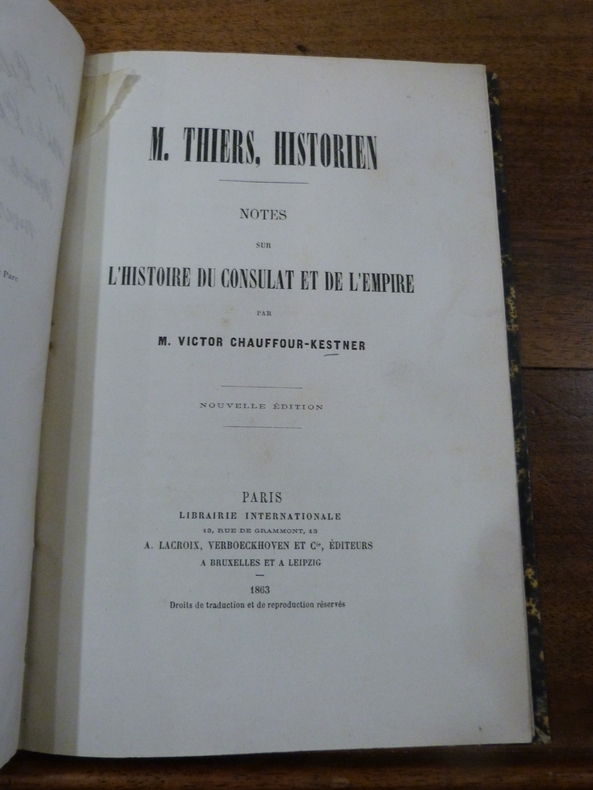 Cet ouvrage est une critique virulente du célèbre ouvrage de Thiers sur la période Napoléonienne. L'auteur, homme politique français, est né à Colmar en 1819. Il devint, fort jeune encore, professeur à la faculté de droit de Strasbourg. Ses idées démocratiques lui valurent d'être élu dans le Bas-Rhin membre de la Constituante en 1848. Il siégea à l'extrême gauche, fut un des adversaires déclarés de la politique présidentielle, et continua, à l'assemblée législative, de combattre par ses discours et par ses votes toutes les mesures proposées et adoptées par la majorité réactionnaire. Forcé, après le coup d'état du 2 décembre, de renoncer à la vie publique et à l'enseignement, M. Chauffour-Kestner se fait industriel.