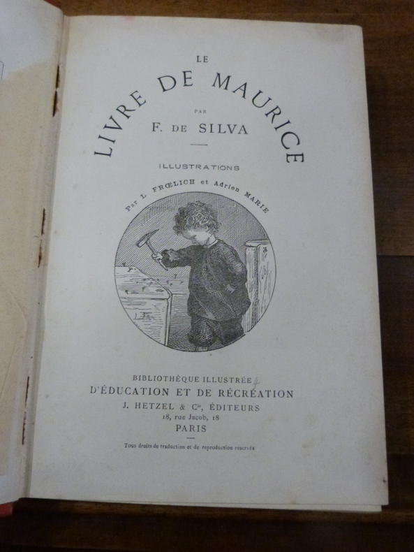 Paris, Hetzel, sans date (fin XIXème). In-8, percaline éditeur polychrome, décors végétaux au dos et sur le plat supérieur, toutes tranches dorées. Titre, 284 pp, 4 ff non chiffrés (catalogue de l'éditeur). Ouvrage illustré de 14 compositions à pleine page, dont une en frontispice, par L. Froelich et Adrien Marie. Coiffes affaissées, coins tordus, couleurs au dos un peu passées, serpente du frontispice déchirée, mouillure sur les 80 dernières pages et le plat inférieur, tache rose dans la marge supérieure en fin de volume.