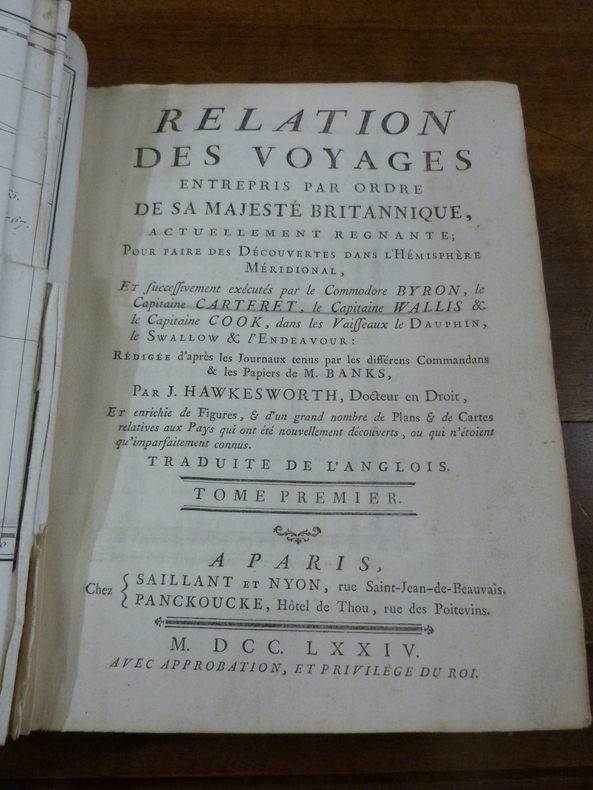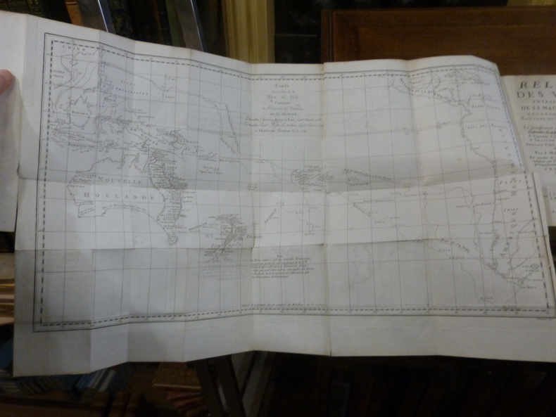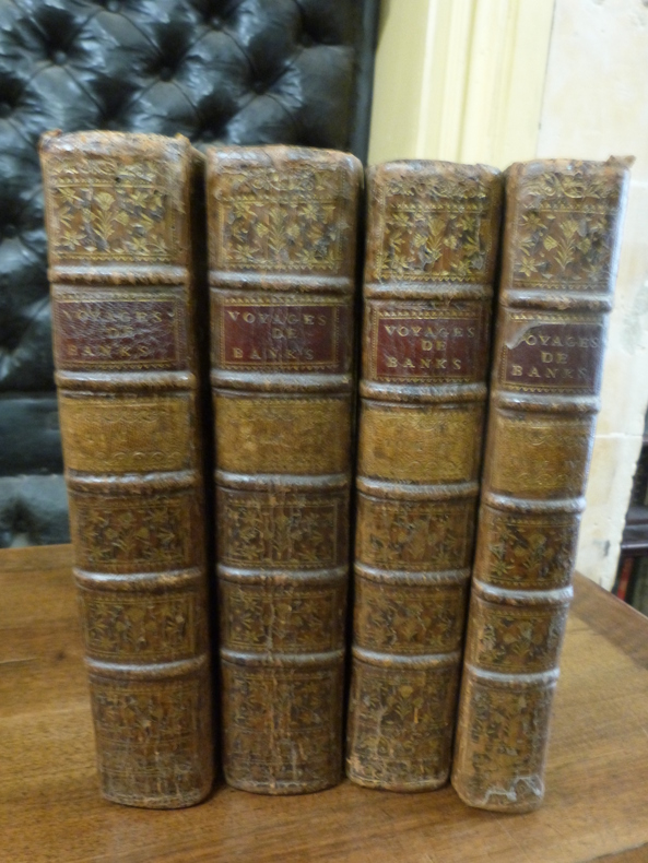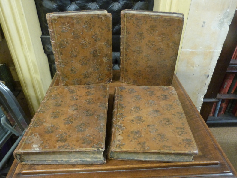 Paris, Chez Saillant et Nyon et Panckoucke, 1774. 4 tomes in-4 en plein veau marbrés au dos à nerfs ornés de filets et fleurons dorés et aux plats encadrés d'un triple filet doré. Tome 1 : 1 f. blanc, faux-titre et titre, XVI, 1 f. de nota, XXXII, 388 pp, 1 f. blanc. Tome 2 : 1 f. blanc, faux-titre et titre, 1 f. d'explication des planches, 536 pp, 1 f. blanc. 16 planches Tome 3 : 1 f. blanc, faux-titre et titre, 1 f. d'explication des planches, 394 pp 1 f. d'achever d'imprimer, 1 f. blanc, 17 planches Tome 4 : 1 f. blanc, VIII, dont faux-titre et titre, 1 f. d'explication de planches. 367 pp, 1 f. blanc. Edition originale française bien complet des 52 cartes planches. Quelques frottements et épidermures légères sur les reliures. trous de vers au dos du tome 1 et en fond de cahiers, coins émoussés, accrocs aux coiffes supérieures des tomes I et IV, déchirure sans manque à la première planche du tome 1.