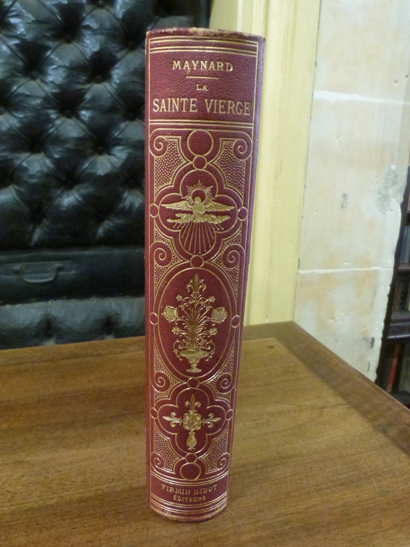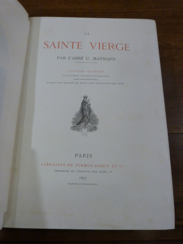 FIRMIN-DIDOT. 1877. In-4. Relié cuir dos-coins. Etat d'usage, Coins frottés, Dos à nerfs, Quelques rousseurs. 528pp. Nbreuses gravures n&b dans le texte. Nbreuses chromolithographies sur planches hors texte. Qq photogravures n&b sur planches hors texte. Frontispice couleur. Tranches dorées. Dos légèrement frotté. . . . Classification Dewey : 232.91-Vierge Marie