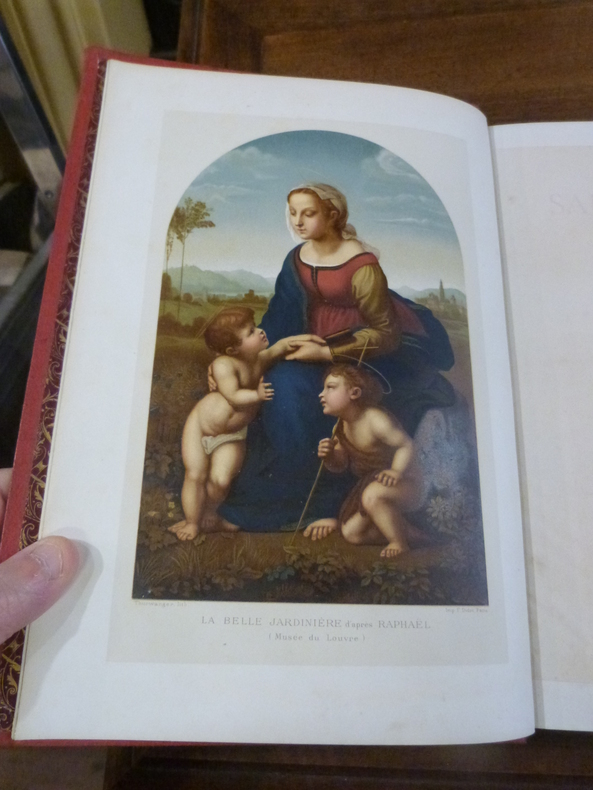 Paris, Bureaux du Rosier de Marie 1877-1878 Ouvrage complet en 2 tomes, reliés en 1 volume, 391 + 395pp., 24cm., reliure cart. (plats marbrés, dos en cuir avec titre doré), qqs. cachets et rousseurs, bon état, rare, [contient les parties suivants: I: Mystères de la vie de la sainte Vierge décrits et expliqués, chefs-d'oeuvre de la peinture rertraçant ces mystères (pp.35-311), II: Les plus belle Vierges du monde, leur description (pp.315-388), III: Tableau synoptique et alphabétique des peintres les plus illustres de la Vierge, avec l'indication de leur école, le titre de leurs ouvrages les plus remarquables en l'honneur de la Vierge et le lieu où ils se trouvent (pp.19-83), IV: Etude particulière sur les peintres français au point de vue de leurs oeuvres en l'honneur de la Sainte-Vierge (pp.89-148), V: Vente diverses de tableaux relatifs à la Vierge avec leur description et leur prix (pp.151-198), Supplément: Iconographie de la personne de la bienheurese Vierge (pp.203-392)], R92059