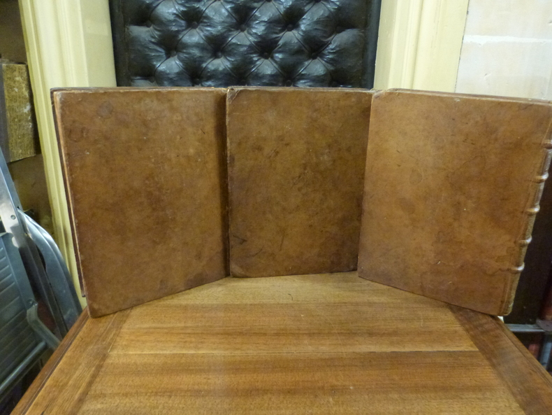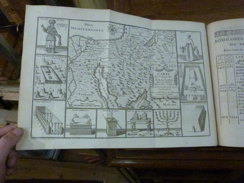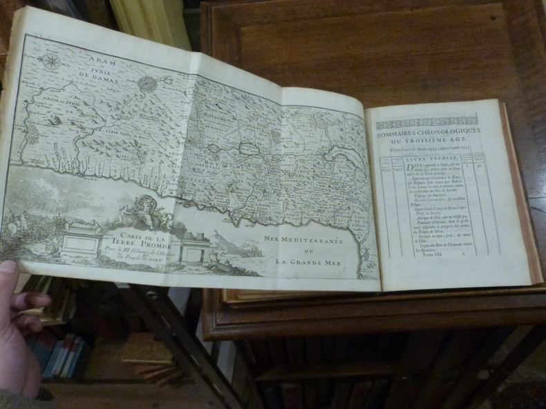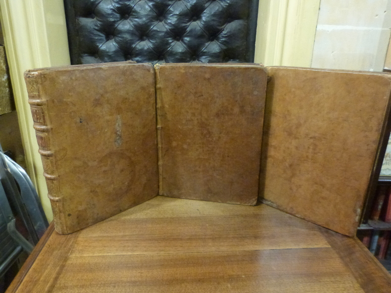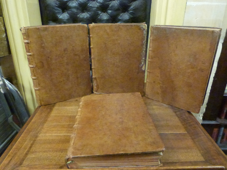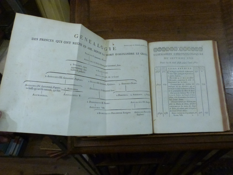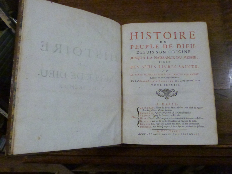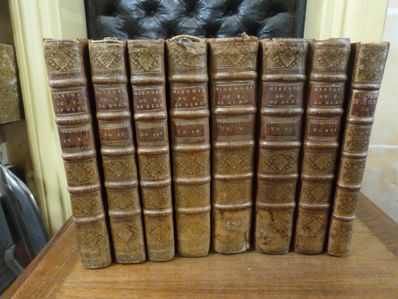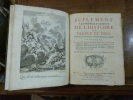 Paris, cailleau, Chardon, Gissey, Bordelet, Henry, 1728 et 1734 pour le supplément. 8 tomes in-4 en plein veau au dos à nerfs orné de filets et fleurons dorés. T 1 : Faux-titre, titre, lxx, 415 pp, (1) pp de privilège ; T 2 Faux-titre, titre, vj, 515 pp (1) pp d'imprimeur ; T. 3.Faux-titre, titre, viij, 461 pp ; T. 4 Faux-titre, titre, viij, 615 pp ; T.5 : faux-titre, titre, viij, 440 pp , faux-titre, titre, 4 pp, 334 pp ; T.6 : Faux-titre, titre, v, 494 pp, 1 . d'inter-titre, iij, 188 pp. T.7 : Faux-titre, titre, xij, 539 pp. Supplément : X dont titre, avertissement et préface, 2 pp, 56 pp, xiv, xi, x (1) pp d'errata, xij, 14 pp, xv-(1) pp d'errata, viij-(1) d'errata pp, viij, vj, (1) pp d'errata, viij, xx, clii (cahiers cc et dd avant le cahier bb). Le supplément est illustré d'un frontispice, d'une vignette de titre, et d'un bandeau de Boucher, de 2 tables, 2 cartes dépliantes et un tableau généalogique. 5 coiffes arasées, mouillure sur le cuir du tome 4, coins frottés. manque de cuir sur deux dos. Papier majoritairement frais.