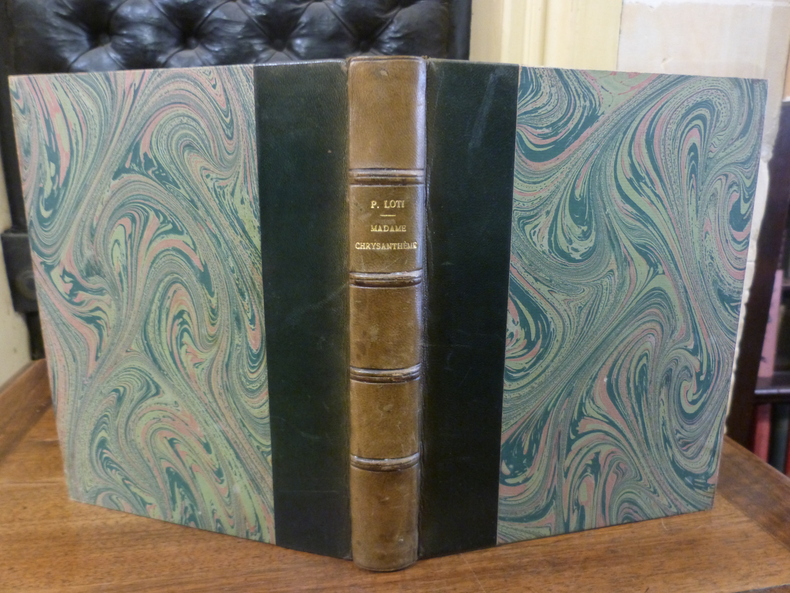 Dans un souci d'une description fidèle, la couverture présente de légères taches. L'état est qualifiable de correct. "Comme beaucoup d'autres romans de Pierre Loti," Madame Chrysanthème" est lié à une affectation militaire de l'écrivain voyageur. En 1885, il part pour l'extrême-Orient et en juillet il séjourne à Nagasaky. En novembre 1887 son roman est publié aux éditions du Figaro (il le sera en 1893 chez Calman-Lévy. Comme certains précédents il est dédié à une femme, ici à Mme la duchesse de Richelieu comme « Pêcheur d'Islande » l'a été à Mme Adam et« Le mariage de Loti » à Mme Sarah Bernardt. Comme souvent, même si ici l'amour n'est pas vraiment au rendez-vous, il est lié à un épisode amoureux comme ce fut le cas dans les deux romans mentionnés ci-dessus, même si les aventures féminines n'ont pas toujours été heureuses pour lui. Dès son arrivée au Japon, en juillet 1885, Loti épouse par contrat d'un mois renouvelable une jeune japonaise de 18 ans(lui en a 35 ans), Okané-San, baptisée "Madame Chrysanthème". Il quittera Nagasaki en août de la même année. Ce "mariage" temporaire qui correspondait à une sorte de coutume assez courante au Japon mais évidemment coûteuse pour l'étranger de passage, était enregistré par la police, se concluait avec un intermédiaire avec l'accord des parents, généralement pauvres, de la jeune fille, ce qui peut paraître assez inattendu et correspond à une forme de prostitution honorable mais n'empêchera pas Okané-San d'épouser plus tard un Japonais. Il forme ensemble un couple bizarre, elle résignée mais pleine d'attentions pour lui et lui qui semble s'ennuyer dans cette relation « pour rire » qu'il vit par convenance ou opportunité"