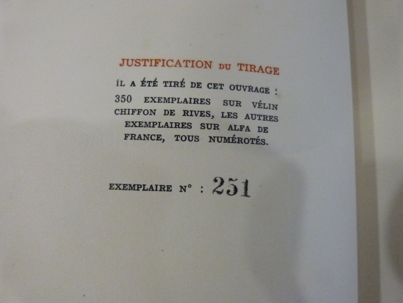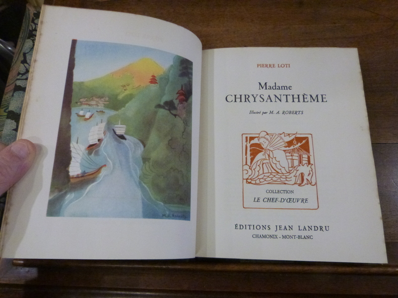 Editions L'Excelsior "Paris, 1926, Editions l'Excelsior, imprimé à Tours par Arrault et Cie, in-4 plein chagrin rouge, tête dorée, couvertures conservées. 219pp. 60 illustrations originales de Léonard Foujita (44 contrecollées dans le texte exceptée la dernière à pleine page et 16 hors-texte, dont le frontispice). Tirage limité à 541 exemplaires, celui-ci, non numéroté est sur Japon Impérial, comme les 25 exemplaires de tête . Il est signé à l'encre noire à la justification par Foujita. Carteret IV-265 ""Edition recherchée et cotée""/ Mahé II-707. Monod II-7312. Madame Chrysanthème, publié initialement en 1888, relate le mariage d'un jeune officier de la marine française avec une jeune fille de Nagasaki. Ces faits sont inspirés de la vie même de Pierre Loti (Julien Viaud) , alors officier de marine. Ce roman connu un tel succès qu'il inspira un opéra à André Messager dès 1893, puis l'opéra de Puccini, Madame Butterfly en 1904, bien que celui-ci ne soit pas une adaptation du roman à proprement parler. Tsouguharu Foujita (1886-1968), francophile dès son enfance (il assiste aux cours de français dès l'école primaire) arrive en France en Août 1913. Très vite il découvre la peinture de PIcasso et devient l'un des peintres les plus recherchés de ce qui deviendra l'Ecole de Paris. Au sommet de sa gloire en 1925, il est nommé Chevalier de la Légion d'honneur.Il est l'un des peintres les mieux payés de Paris. La même année, en 1926, il illustre deux ouvrages de Pierre Loti : Madame Chrysanthème (1888) et, pour un autre éditeur, Devambez, La troisième jeunesse de Madame Prune (1905) que l'on peut considérer comme une suite du premier roman. L'exemplaire que nous proposons, sans doute un exemplaire de ""passe"" de l'éditeur, sur Japon, est signé en français et en japonais par Foujita, mais n'est pas numéroté. Il ne comporte pas de suite des illustrations en noir."