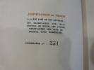 Chamonix - Mont-Blanc, Editions Jean Landru, 1950. In-8, demi basane, dos à nerfs, titre doré. 249 pp, 2 pp non chiffrées. Tirage limité numéroté à 350 exemplaires sur vélin chiffon de Rives, celui-ci portant le numéro 251. Ouvrage illustré de 8 compositions hors-texte en couleurs, dont une en frontispice et de bandeaux et culs-de-lampe en rouge par M.A. Roberts. Plat supérieur conservé. Dos insolé et un peu frotté, rousseurs sur les tranches et à l'intérieur, fortes par endroits.