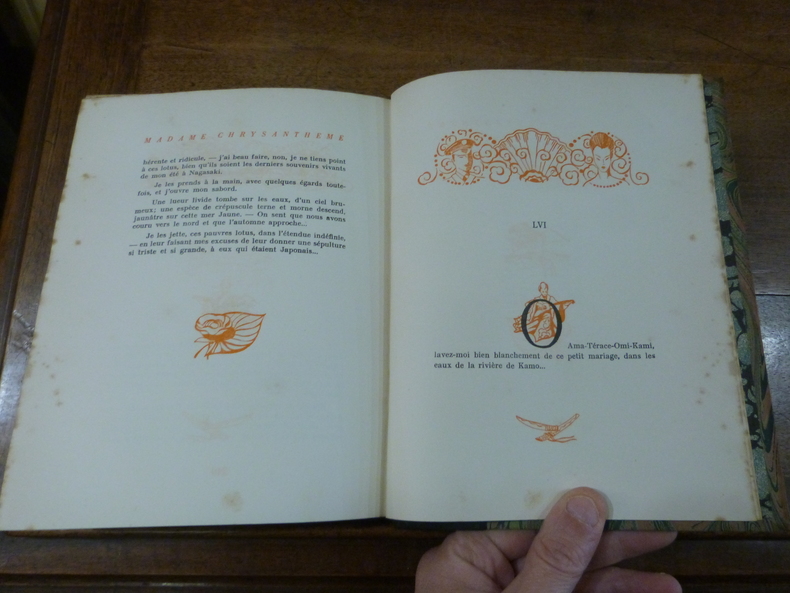 . Paris, Éditions Pierre Lafitte, 1923, 1 vol. in-4 (30 x 22,3 cm), 252 p. comme suit : 1 f. de faux-titre, 1 f. de frontispice couleur, 1 f. de titre, p 5 : avant-propos par Henri de Régnier, p 13 : notice biographique, p 19 : Madame Chrysanthème, p 127 : Pêcheur d'Islande, 1 f. de table des ouvrages. Deux romans complets illustrés, en noir et blanc in-texte et en couleur hors-texte, par Lucien Simon, A. Gorguet, A. Gumery, F. Lorioux et Lévy-Dhurmer. Deux récits ciselés prenant place au Japon (Madame Chrysanthème, 1887) et en Islande (Pêcheur d'Islande, 1886). Pierre Loti (1850-1923) : pseudonyme de Louis Marie Julien Viaud, romancier, officier de marine, français.