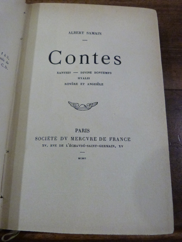 Société du Mercure de France 1905 in12. 1905. Relié. 4 volume(s). Contes: Xanthis - Divine Bontemps - Hyalis - Rovère et Angisèle (édition 1902) + Le Chariot d'or symphonie héroïque (6e édition 1905) + Aux Flancs du vas suivi de Polyphème et de poèmes inachevés (5e édition 1905) + Au jardin de l'infante (10e édition 1905)