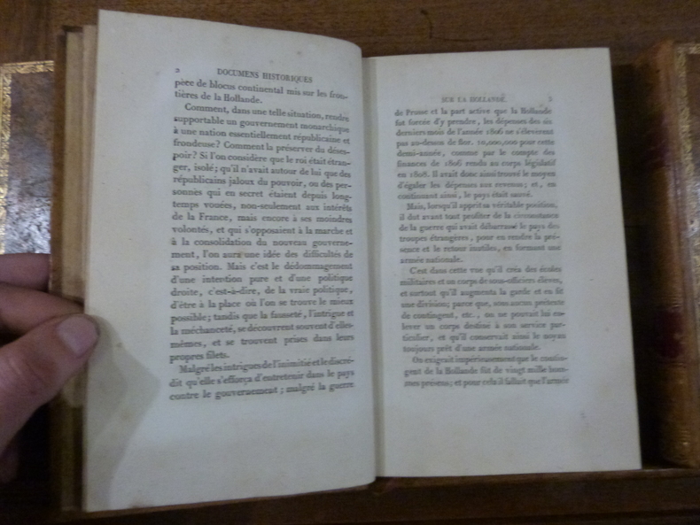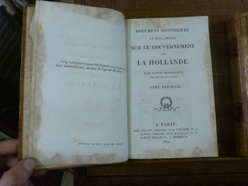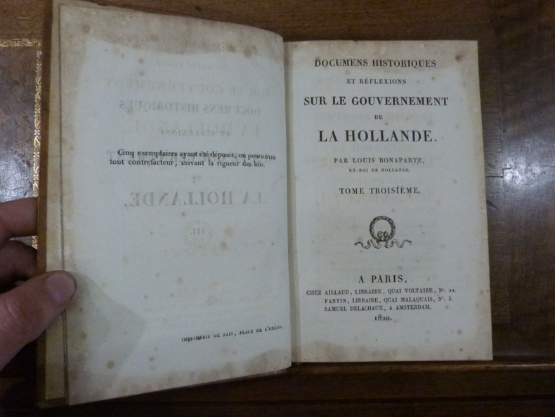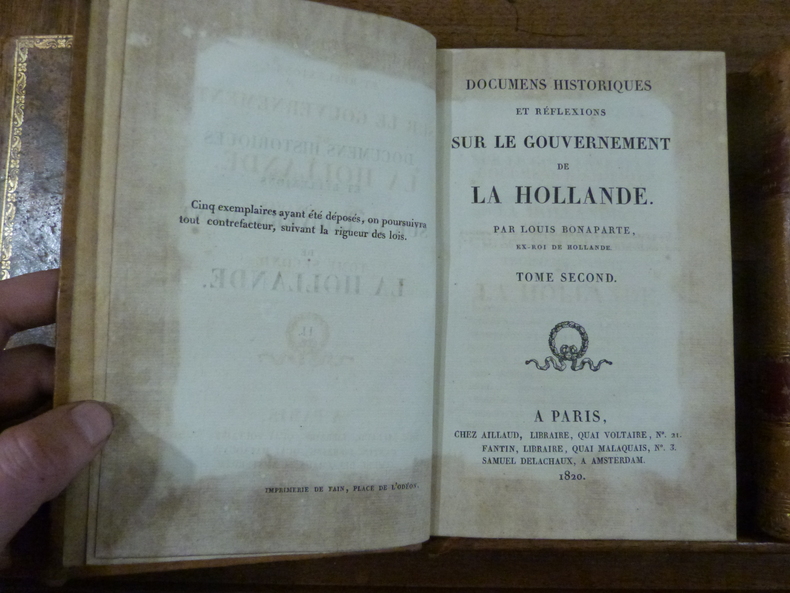Edition originale, de cet ouvrage peu courant ou le Roi Louis de Hollande (frère de Napoléon 1er), dresse le compte-rendu de son administration de 1806 à 1810. Cet écrit contribua à consolider la bonne réputation qu'il avait dans le pays, le peuple hollandais lui étant assez favorable. Toutefois l'Empereur n’appréciait pas la politique de son frère, auquel il reprochait de faire passer les intérêts de la Hollande avant ceux de la France, et mis fin au règne de son frère en 1810. Ex-libris armorié gravé du Marquis Guy Henri d'ANDIGNE (1813-1879). accompagné de la devise : Aquila Non Capit Muscas. Inscription manuscrit de classement : Bibliothèque de Resteau - 881.