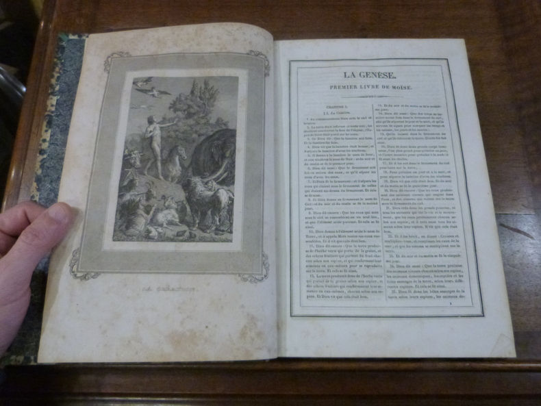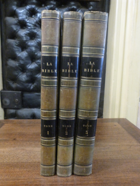 Au Bureau Central Paris 1836 3 volumes in-4 ( 285 X 190 mm ), demi-veau bleu, dos lisse ornés de grands fers romantiques dorés, ( reliure de l'époque ). Edition romantique en 3 volumes de la Bible dans la traduction du Maistre de Sacy, ornée de planches hors-texte gravées sur acier par Peronard, Lalaisse, Skelton, Desjardins, etc. Texte élégamment encadré d'un triple filet noir gras et maigre. Plat supérieur du tome 1 frotté, quelques rousseurs, agréable exemplaire.