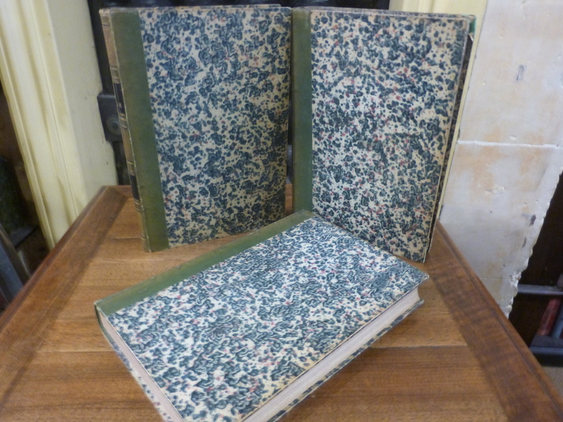 Paris AU BUREAU CENTRAL 1837 -in-8 demi-basane 3 volumes, reliure demi-basane violet (half binding sheepskin) grand in-octavo (27 x 19 cm), RELIURE ROMANTIQUE D'EPOQUE, dos long (spine without raised band), Titre et Tomaison frappés "or" au centre du dos dans un encadrement d'un filet "or" avec de part et d'autre un gros fleuron romantique "or" le tout dans un encadrement d'un filet "or", double filets fins "or" et triple filet plus large "or" en tête, double filets fins "or" et triple filet plus large "or" + roulette large "or" en pied, papier marbré marron et crème aux plats (cover with marbled paper), tranches lisses (edges smooth) jaspées bleues, texte à 2 colonnes (text - 2 coloumns), orné de 155 planches hors-texte gravées sur acier en noir, (pagination continue des tomes I et II) 304 + 305 à 647 + 620 pages, 1837 à Paris AU BUREAU CENTRAL Editeur,