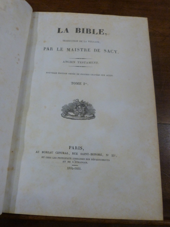 Nouvelle édition ornée de plus de 150 figures hors texte gravées sur acier. Bon exemplaire très frais et sans rousseurs. — En 1666, Isaac Lemaistre, sieur de Sacy (1613-1684), prieur de l'Abbaye de Port-Royal, alors emprisonné à la Bastille pour jansénisme (il y restera du 13 mai 1666 au 14 novembre 1668), profite de ces loisirs cloîtrés pour achever la traduction de l'Ancien Testament commencée par son frère Antoine à partir de la Vulgate, mais qui ne lui convenait pas. Il devient ainsi le maître d'œuvre d'une traduction en langue française de la Bible, dite "Bible du Port-Royal" ou "Bible de Sacy". Au XVIIe siècle, sa publication a rencontré de nombreux obstacles, comme tous les livres de Port-Royal soupçonnés de jansénisme.