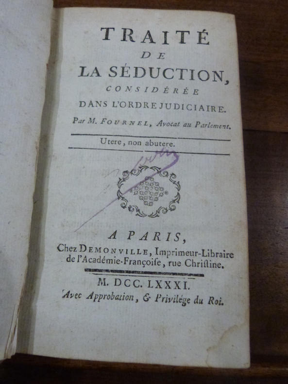 Édition originale. La séduction ici reprochée envisage toute sorte de « commerce illicite » : mineures, veuves, prostituées, condamnées à mort, réclamant justice contre mineurs, déments, gens d'Église, domestiques, pères de famille, etc.- De la poursuite en paternité et de l'avortement. Exemplaire de Jules Boblin, avec sa signature. Exécuteur testamentaire et ami de Joris-Karl Huysmans, il avait formé une très importante bibliothèque sur l'histoire de Paris notamment. Quérard, III, 183 – Gay, III, 1237.- Reliure frottée, accroc en queue...