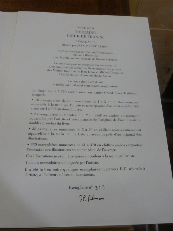 Richelieu, Desmasures, L'oeil et la plume, 1995. In-folio, en feuilles, sous étui de velours à fenêtre, titre doré au dos. 96 pp. Tirage limité numéroté à 380 exemplaires sur papier Grand Rives, celui-ci étant un des 330, portant le numéro 315. Ouvrage illustré de 45 illustrations en noir, dont deux à double page et d'une composition en couleurs par Jean-Pierre Rémon. Tous les exemplaires sont signés par l'artiste. Etui un peu empoussiéré, le feuillet de la composition en couleurs légèrement plié, sinon très bon état.