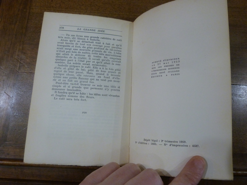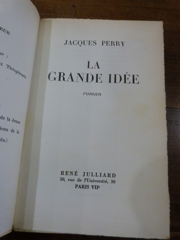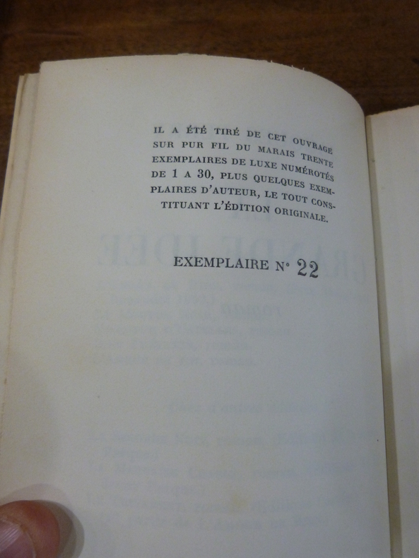 Paris, Julliard, 1959. In-12, broché. 278 pp. Edition originale, tirage limité numéroté à 30 exemplaires sur pur fil du Marais, seul grand papier, celui-ci portant le numéro 22. Dos un peu piqué, petites taches noires peu voyantes sur le plat inférieur, dos et tranches un peu piqués.